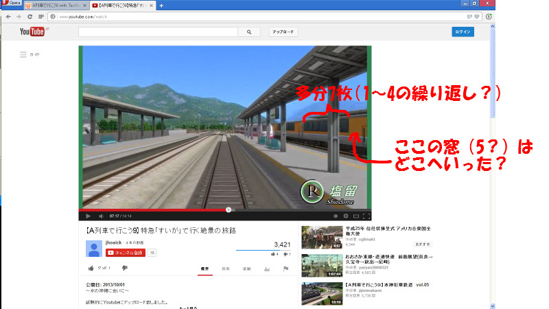 2013年12月10日 23:59 A列車で行こう9 804生誕イブ 唐突ですがYouTubeっていいですね。 480p画質(?)なら、ネットブックでもそれなりにストレスなく見れます。 時々「メモリの使用率が100%を記録しました」みたいな警告が○ートンから発せられますが、ニコ動のように常時映像が遅延して飛び飛びになるようなこともあまりないですし。 さらに思いつきでネットブックにデスクトップPC用のモニターを繋げてみたところデュアルモニター化したのでウハウハです。 やまぢの予想では ネットブックの画面と全く同じものがデスクトップPC用のモニターに映し出される(プレゼン状態) ネットブックの画面は映らなくなり、代わりにデスクトップPC用のモニターに映し出される このどちらかになると思っていたのです。 デュアルモニターって何となく「専用の機器を間に挟まないと出来ない、敷居の高いもの」という先入観があったので(汗 そんなこんなでYouTubeで色んな動画を見つつ、右端の関連動画を梯子していたら、こんな動画を見かけたのです。 犬山橋でまさかのハプニング - YouTube 道路との併用橋だったらしい犬山橋の、現役時代(?)の動画ですね。 相変わらずWikipediaを流し読みした程度の知識しか持ち合わせていないので、犬山橋そのものについては(以下略 で、この動画の中で 冒頭のこの電車を見て、なんかA9で似た形の車両を見たような気がしたんです。 見た気はするが、あいにく今はA9が動くPCを持ち合わせていない(白目 なのでTexMod Wikiであちこちクリックしまくった結果。 ※A列車で行こう9 with TexMod wiki>JR東日本 特急型ページ内、ともっちゃ氏制作「251系リニューアル塗装」より画像を拝借 こいつでした。 似て・・・ま・・・せん? 一応tgaファイルを開く環境はネットブックにもあるので、やまぢなりにあれこれ予想はしてみたんです。 ともっちゃ氏のtgaファイルと、TexMod wikiにある画像をじっくり見比べて・・・ 多分この網掛けの部分が「いつもの変な引き伸ばし」処理を施されているんじゃ?とか。 むしろ変な引き伸ばしがされていなければ、先頭車の展望席(?)部分もなんとかなるような気がしなくもないし、何ともならない気もしなくもない(ぇ 次に中間車の窓割を考えてみようと思ったのですが。 ぶっちゃけTexMod wikiの1枚絵だけじゃあ全く分からん← なので251系を使ってる動画がどっかになかったかなー?と8.04秒ほど考えた結果: 【A列車で行こう9】特急「すいが」で行く絶景の旅路 - YouTube ありました(ぉ オリジナル塗装になってはいますが、多分窓の位置は弄っていないと信じてこの動画で検証(推測)してみることにします。 とはいえ、ネットブックだとどんなに一時停止のクリックを頑張っても限界がありまして。 なんとかSSとして使えそうな2両目です。 画像内にも書いたとおり、多分tgaファイルにおける4つの窓をどうにか割り振って6枚にしているような気がします。 例えば123434とか、123421とか。 ・・・○rtdinkなら123321のパターンもあり得そうで怖い((( ※あくまでも推測です。 問題は3両目~でして。 同時進入してくるフレッシュひたちの塗り替え車両をかわしつつ、ネットブックで一時停止をどれだけ頑張ってみても、このSSしか推測に使えそうな絵が撮れませんでした。 とりあえずこの1枚で可能な範囲の推測はと言うと 窓が7枚になっている、ように見える ドア横にあったはずの窓(tgaファイル内の「5?」)が見当たらない 1に関しては正直「気のせい」であって欲しい(願望) 本当に7枚だと、例えば「1234234」と「1234321」が混在する可能性が出てきますので。 そうすると、犬山橋動画の冒頭に出てきたパノラマスーパー(?)のような「1両2ドア」形にするのが非常に困難な事態となりかねない。 2番目はアレっすか、1ドットの引き伸ばしっすか。 そもそも何故2両目と3両目以降で敢えて変えているのか。 鉄道のことに詳しくない人間には分かりかねるのですが、きっと何かしらの理由があるのでしょう。 そもそも実際のテクスチャ割り当てが現状自分では確認できないので、これらが合ってるのかどうかすら怪しいところです。 ただまぁblogの更新ネタとしてはちょうどいいかな?と思ったので、あれこれ書き殴ってみましたとさ。 ・・・そういや251系って4両を組めたっけ? 2両目と3両目をわざわざ変えている(疑惑がやまぢの中である)あたり、なんとなく6~10両だったような気がする(ぉぃ さらにさらに、もっと根本的な部分として、塗り替えたところで使う場所がない← ただまぁblogの更新ネタとしては(以下7行上に戻る) そんなわけでめばちこさん、この塗り替え案はいかがでしょうか。名鉄っすよ、名鉄! ※無茶振りは迷惑になるのでやめましょう [0回] スポンサーリンク 2013年12月10日 23:59 A列車で行こう9 0件