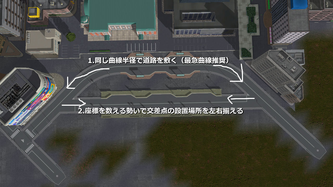 ただご覧の通り、基準(この場合は引き込み型バス停)からの曲線道路における半径を左右できっちり合わせ、更に信号機を伴わない三叉路の位置も完璧に合わせさえすれば、調整道路を使わずとも直線道路だけで繋げることができた(←伝われ)のは大きな収穫でした。