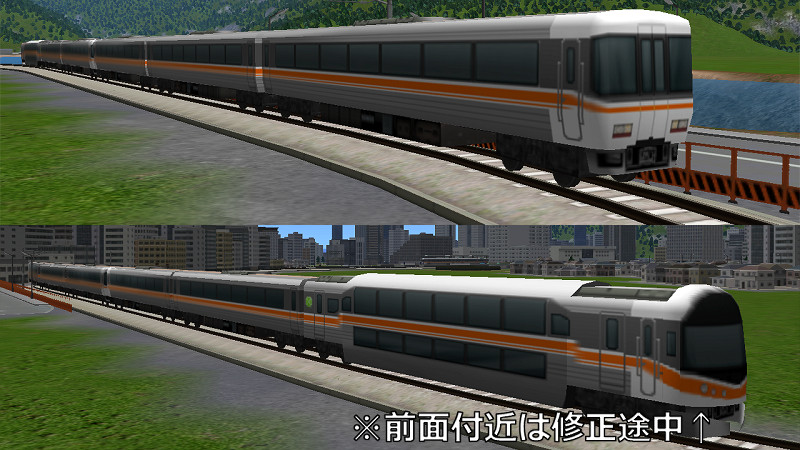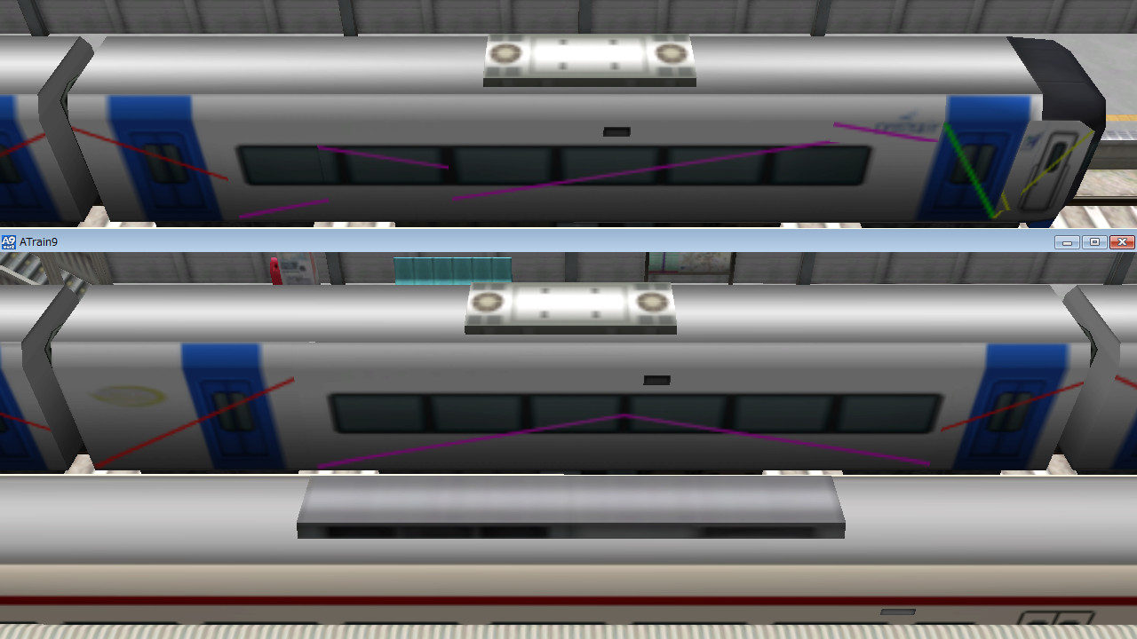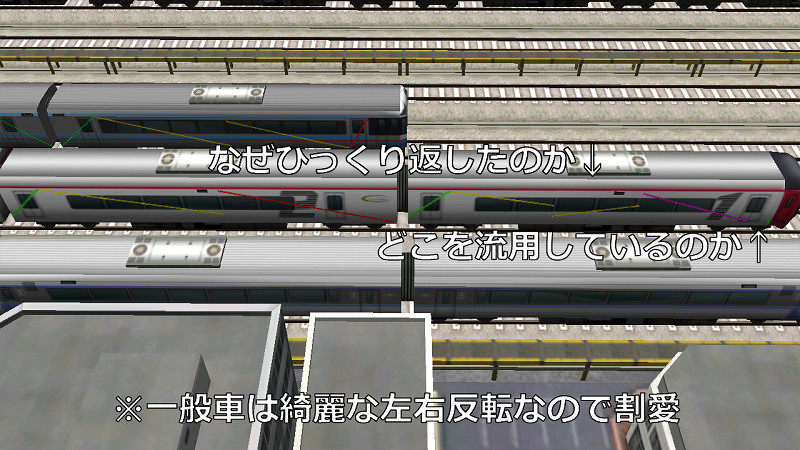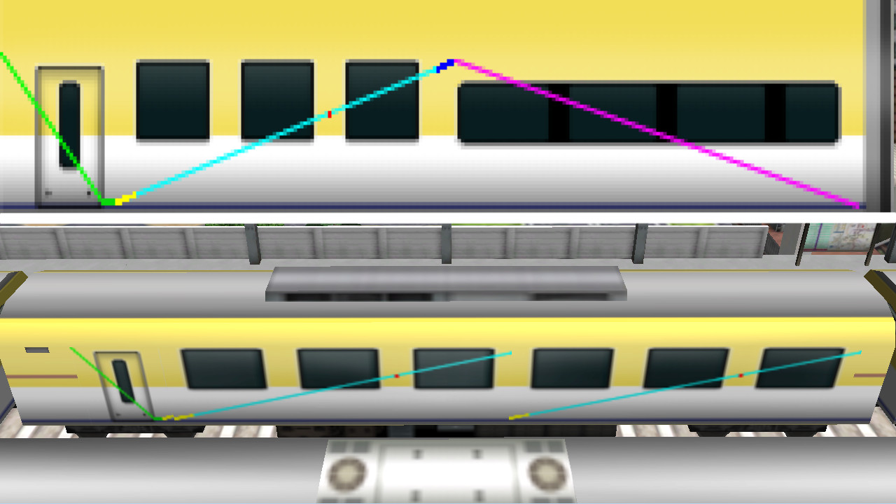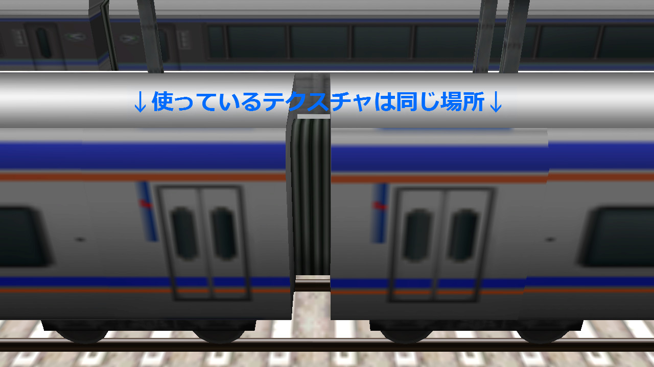 - 中間車のドア部分がテクスチャ割り当ての仕様上1ドットずれてしまいます。(画像はサザン化を試みていた頃のもの)